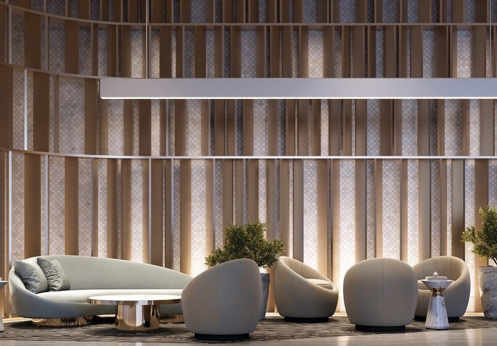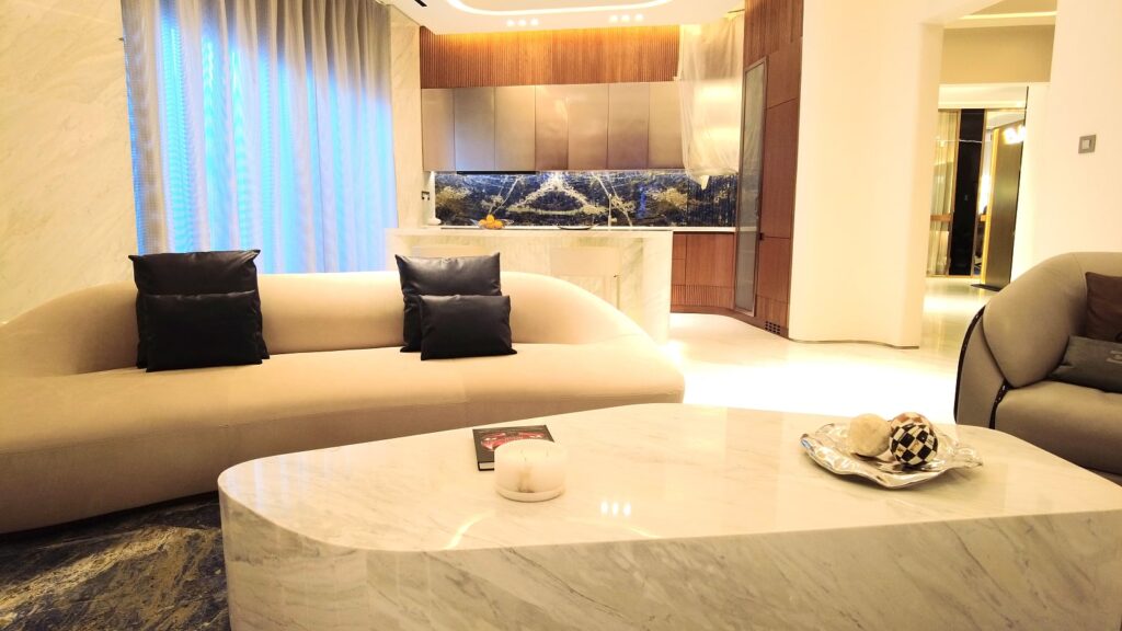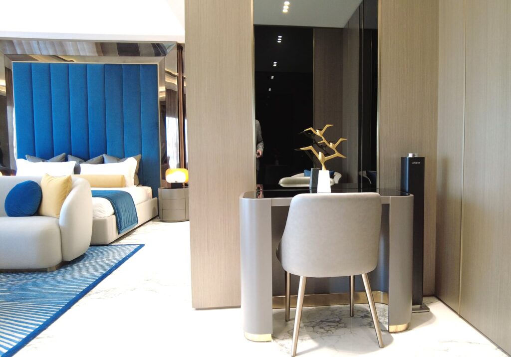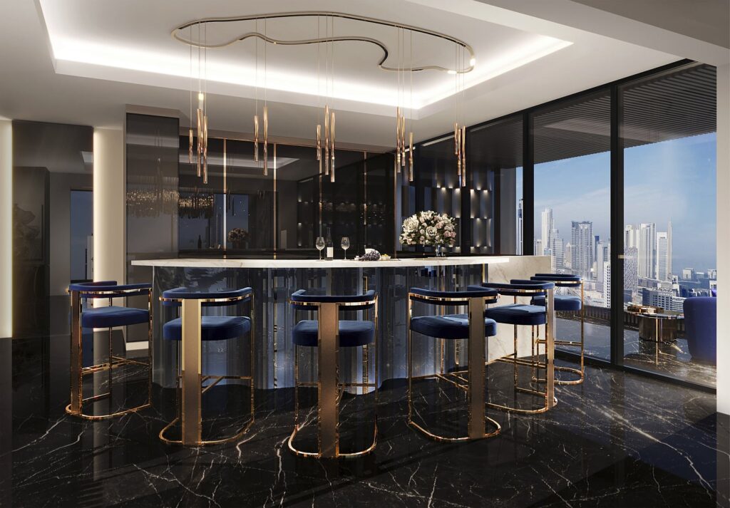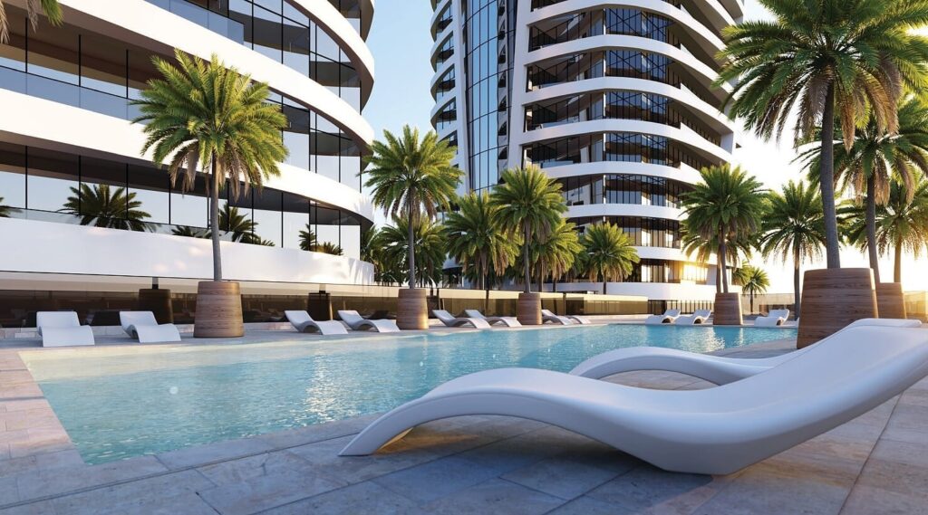 Bugatti residence apartments in Dubai offer the luxury of taking your car to your home, a jacuzzi and a private pool in each apartment, and a luxury life in the center of the metropolis.